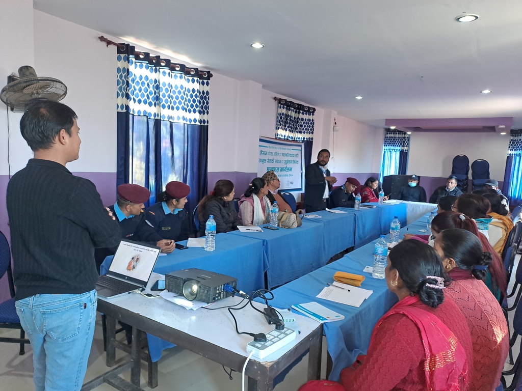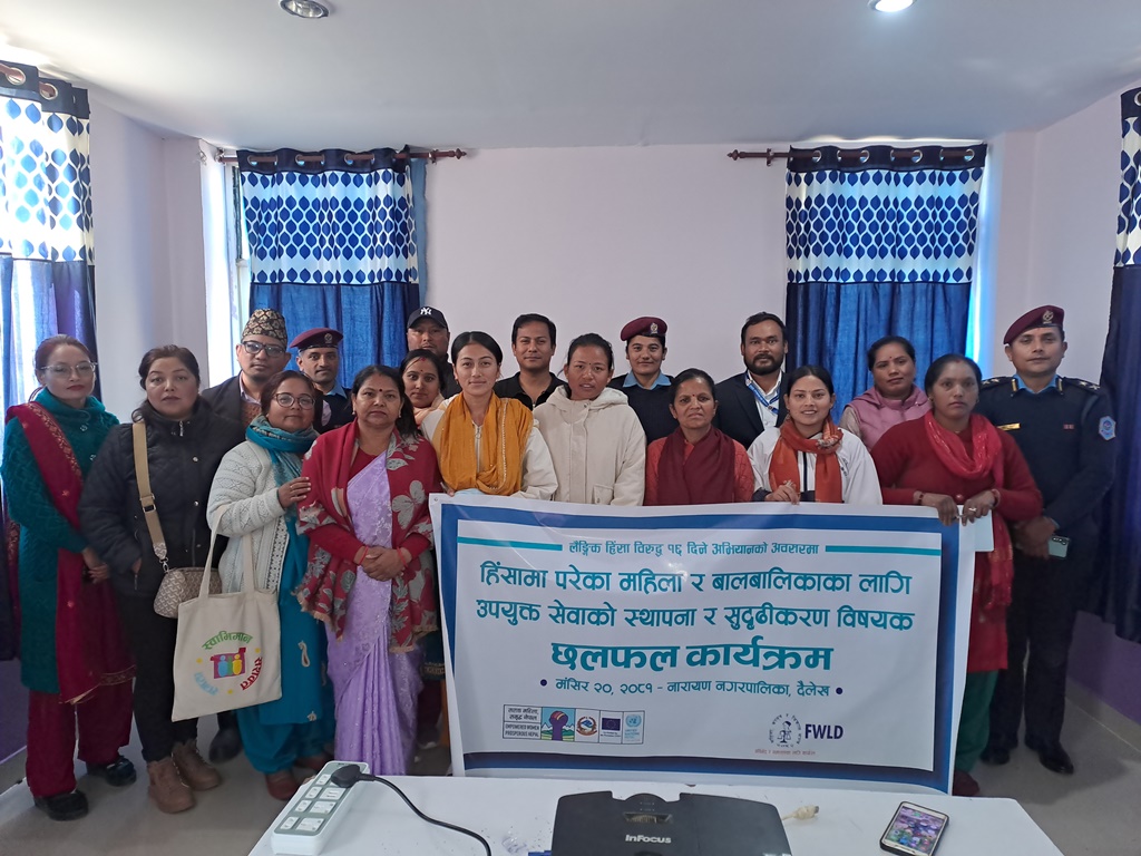 छलफल कार्यक्रममा ‘महिला, कानून र विकास मञ्च (एफडब्लूएलडी)’का अधिवक्ताद्वय गीता कोइराला र दिपेश श्रेष्ठले लैंगि हिंसामा परेका महिलाहरुको न्यायको निम्ति कानूनी व्यवस्था, पुनस्र्थापना सवाल, न्यायिक प्रक्रिया लगायत विषयमा सहजीकरण गर्नुभएको थियो ।