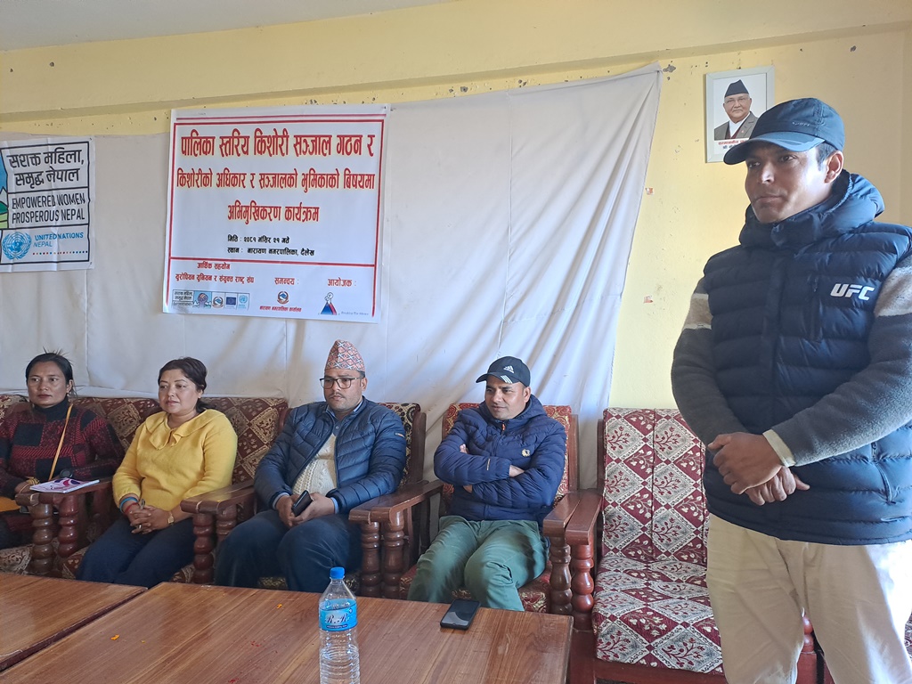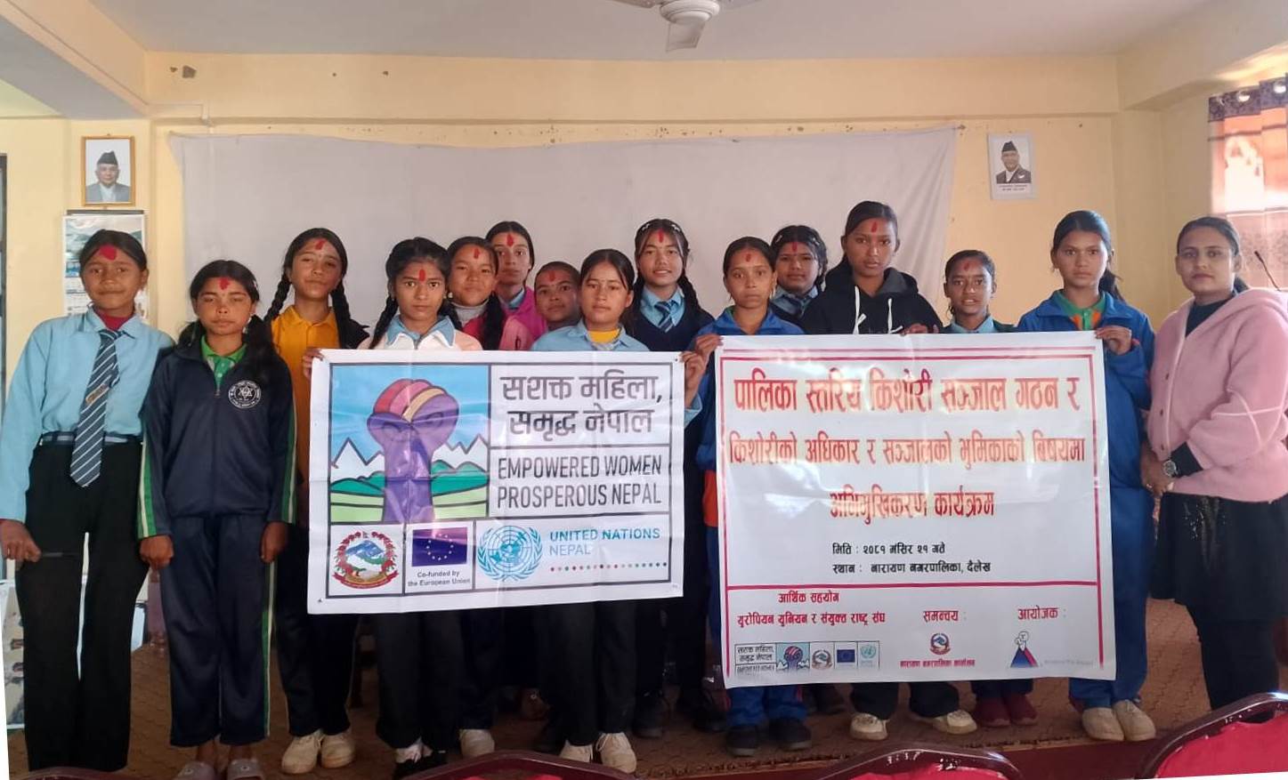 दैलेख – आवाज संठस्थाको आयोजनामा युरोपेली संघको आर्थिक सहयोग र संयुक्त राष्ट्र संघीय विकास नियोगहरु यूनिसेफ, यूएमएफपीए, विश्व श्रम संगठन र यूए उमनले संयुक्त अभियानमा सञ्चालित सशक्त महिला समृद्ध नेपाल परियोजनाले दैलेखको नारायण नगरपालिका स्तरीय किशोरी सञ्जाल गठन गरेको छ ।
