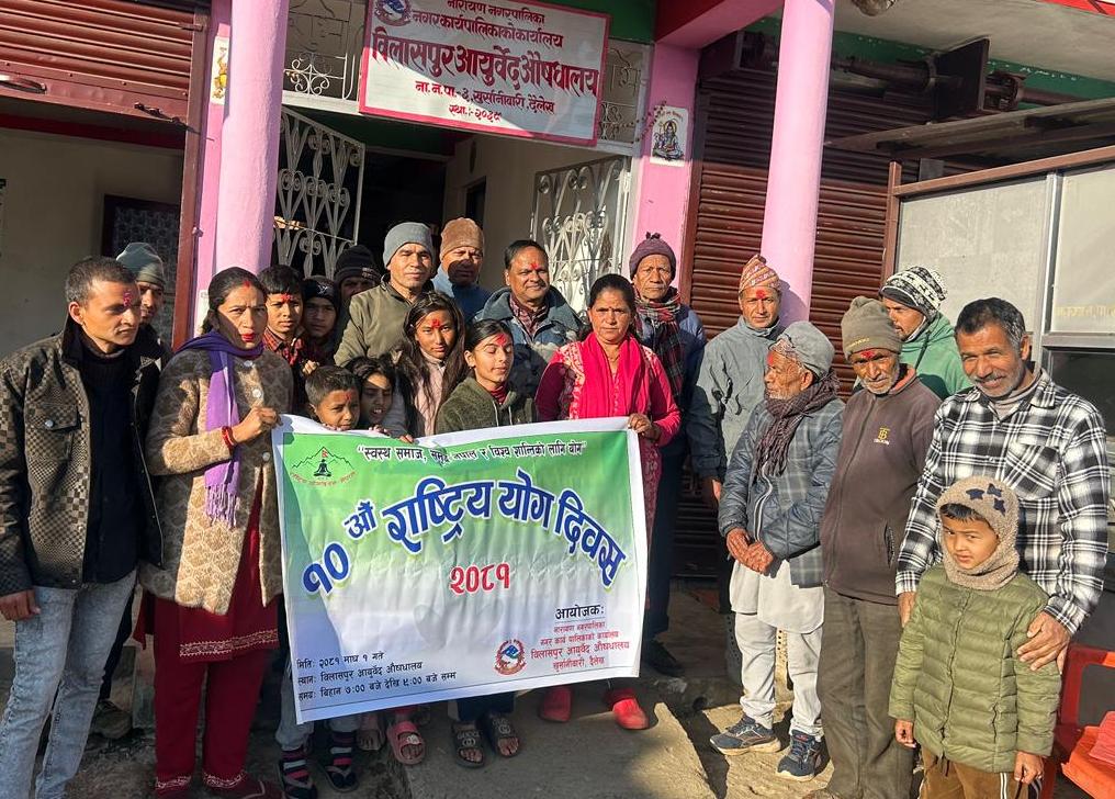 यसैगरी राष्ट्रिय योग दिवसको अवसरमा नारायण नगरपालिका–३ को खुर्सानीबारीस्थित बेलासपुर आयुर्वेद कार्यालय जनप्रतिनिधि, स्थानीय वासिन्दाहरु समेत सहभागितामा योग अभ्यासले स्वास्थ्यमा पैदा गर्ने ऊर्जा र आयुर्वेदिक उपचारको दिर्घकालिन फाइदा बारे कार्यालय प्रमुख राजीव भारतीले प्रकाश पार्नुभयो ।