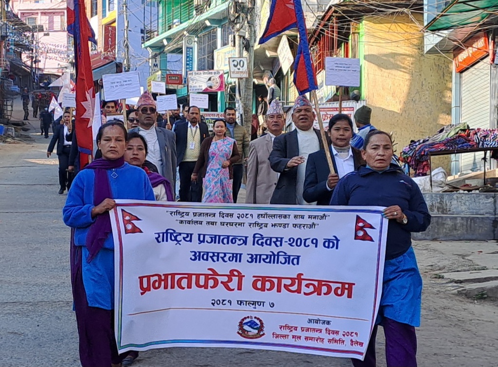 जिल्ला समन्वय समिति दैलेखका प्रमुख नमराज शाहीको अध्यक्षतामा भएको कार्यक्रममा नागरिक समाजका प्रतिनिधिहरु दैलेख उद्योग बाणिज्य संघका बरिष्ठ उपाध्यक्ष नरेन्द्र थापा र नेपाल पत्रकार महासंघका जिल्ला अध्यक्ष अमर सुनारले प्रजातन्त्र दिवसको महत्व बारे प्रकाश पार्नुभएको थियो । त्यसअघि दैलेख सदरमुकाममा झाँकी र नारा सहितको प्रभातफेरीले नगर परिक्रमा गरेको थियो ।