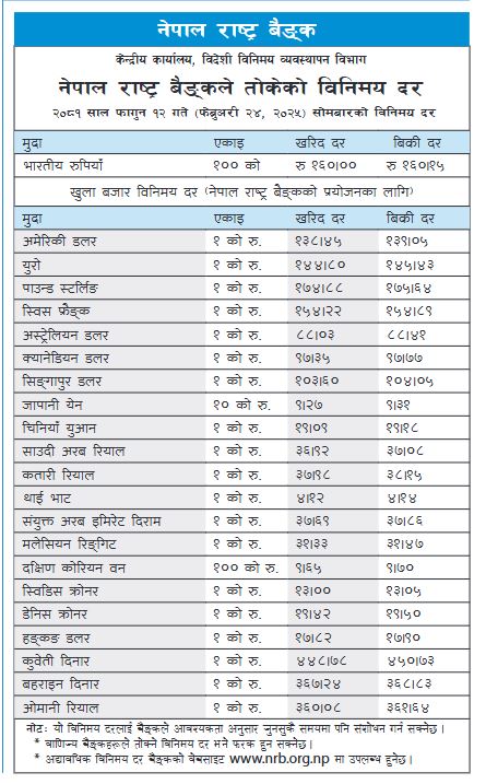 काठमाण्डौं – नेपाल राष्ट्र बैंक केन्द्रीय कार्यालयले फागुन १२ गतेको लागि नेपाली मुद्राको विनिमय दर तोकेको छ । अमेरिकी डलरमा अस्तिदेखिकै निरन्तरता कायम राख्दै खरिद एक सय ३८ रुपैंयाँ ४५ पैंसा र बिक्री दर एक सय ३९ रुपैंयाँ ५ पैंसा ताेकेकाे छ ।