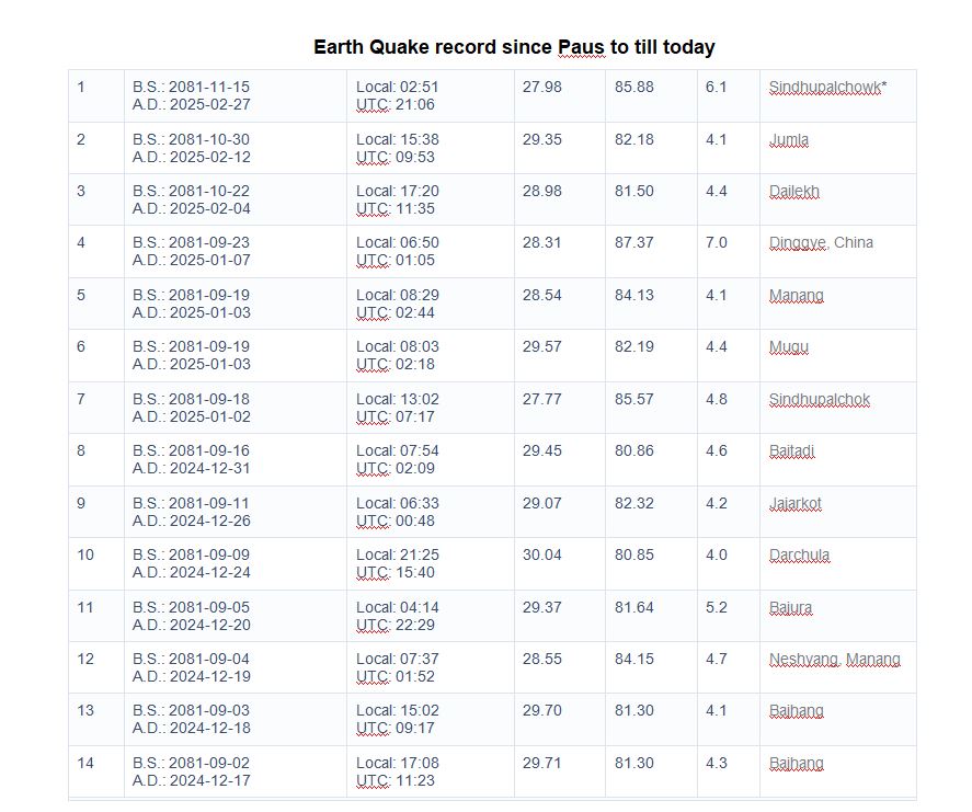 पुस ३ गतेपछि यो समेत ४ रेक्टर माथिका १४ वटा भूकम्प गएको राष्ट्रिय भूकम्प मापन तथा अनुसन्धान केन्द्रले जनाएको छ, पुस ५ गते बाजुरा केन्द्रबिन्दु भएर ५.२ रेक्टरको भूकम्प गएको थियो । राष्ट्रिय भूकम्प मापन तथा अनुसन्धान केन्द्रले ४ रेक्टर माथिका भूकम्पलाई अभिलेखमा जनाउने गर्दछ, ६ रेक्टर माथिको क्षति पुर्याउने गर्दछ ।