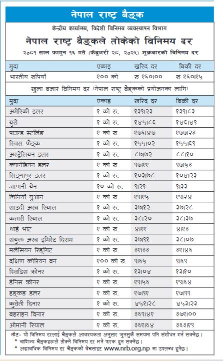 काठमाण्डौं – नेपाल राष्ट्र बैंक केन्द्रीय कार्यालयले आज फागुन १६ गतेको लागि नेपाली मुद्राको विनिमय दर तोकेको छ । अमेरिकी डलर खरिद एक सय ३९ रुपैंयाँ २३ पैंसा र बिक्री दर एक सय ३९ रुपैंयाँ ८३ पैंसा तोकेको छ ।