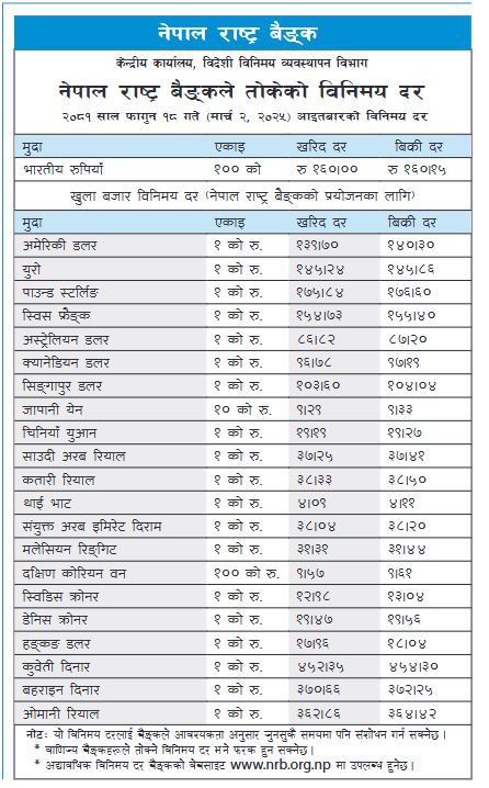 काठमाण्डौं – नेपाल राष्ट्र बैंक केन्द्रीय कार्यालयले आज फागुन १६ गतेको लागि नेपाली मुद्राको विनिमय दर तोकेको छ । अमेरिकी डलर खरिद एक सय ३९ रुपैंयाँ ७० पैंसा र बिक्री दर एक सय ४० रुपैंयाँ ३० पैंसा तोकेको छ ।