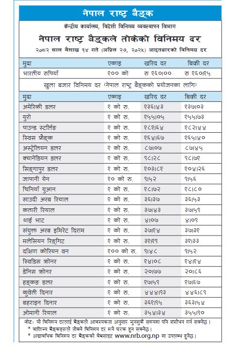 काठमाण्डौं – आज वैशाख १४ गते, नेपाल राष्ट्र बैंकले आजको लागि नेपाली मुद्राको विनिमय दर तोकेको छ । अमेरिकी डलर खरिद दर १३६ रुपियाँ ४३ पैंसा र बिक्री दर १३७ रुपियाँ ३ पैंसा तोकेको छ । त्यसैगरी १० जापानी ऐनको खरिद दर ९ रुपियाँ ५२ र बिक्री दर ९ रुपियाँ ५६ तोकिएको छ ।
