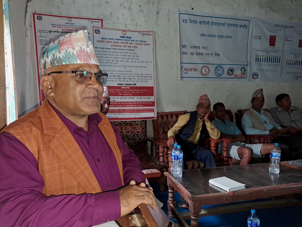 त्यसबखत दुल्लू नगरपालिका-११ का वडाध्यक्ष सुरत भण्डारीले वडा क्षेत्रमा सञ्चालित खानेपानी आयोजना र नयाँ निर्माण भइरहेको आयोजनाहरुको उपभोक्ता समितिले निर्वाह गर्नुपर्ने सुशासन, पारदर्शिता, जवाफदेहितासंगै उपभोक्ताहरुले श्रमदान दिए आयोजना गुणस्तर भरपर्दो हुने बताउदै आवश्यक परेको अवस्थामा वडा कार्यालयबाट सधैं सहयोग रहने बताउनुभयो ।