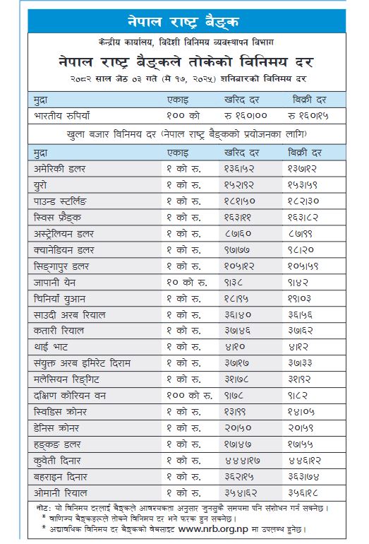 यसैगरी युरोपियन यूरो खरिद १५२ रुपियाँ ९२ पैंसा र बिक्री दर १५३ रुपियाँ ५९ पैंसा कायम गरेको नेपाल राष्ट्र बैंकले तोकेको विनिमय दरमा जनाइएको छ । भारतीय एक सय रुपियाँ खरिद दर १६० रुपियाँ र बिक्री दर १६० रुपियाँ १५ पैंसा रहेको नेपाल राष्ट्र बैंकको विनिमय दर जनाएको छ ।