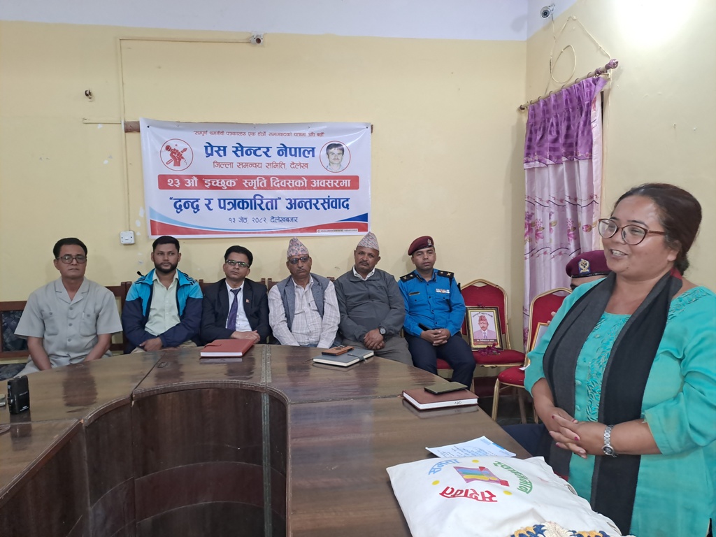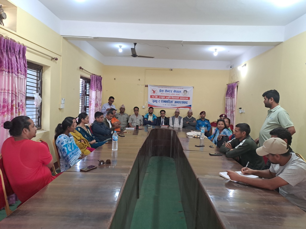 प्रेस सेण्टरका जिल्ला अध्यक्ष तीर्थ भण्डारीको अध्यक्षतामा भएको कार्यक्रममा नेपाल पत्रकार महासंघ दैलेखका अध्यक्ष अमर सुनार, पूर्व केन्द्रीय सदस्य नविन रिजाल, पूर्व जिल्ला उपाध्यक्ष कृष्ण देवकोटा, दैलेखका प्रहरी इञ्चार्ज डीएसपी गणेशबहादुर बराल, फोटो पत्रकार महासंघका केन्द्रीय सचिव विशाल सुनार, बार एशोसिसनका जिल्ला अध्यक्ष ललित थापा, प्रेस युनियनका जिल्ला सभापति अभिसेक सोनी, महिला सशक्तिकरण मञ्चका अध्यक्ष सविना बिकले द्वन्द्व र पत्रकारिता विषयमा बोल्नुभएको थियो ।