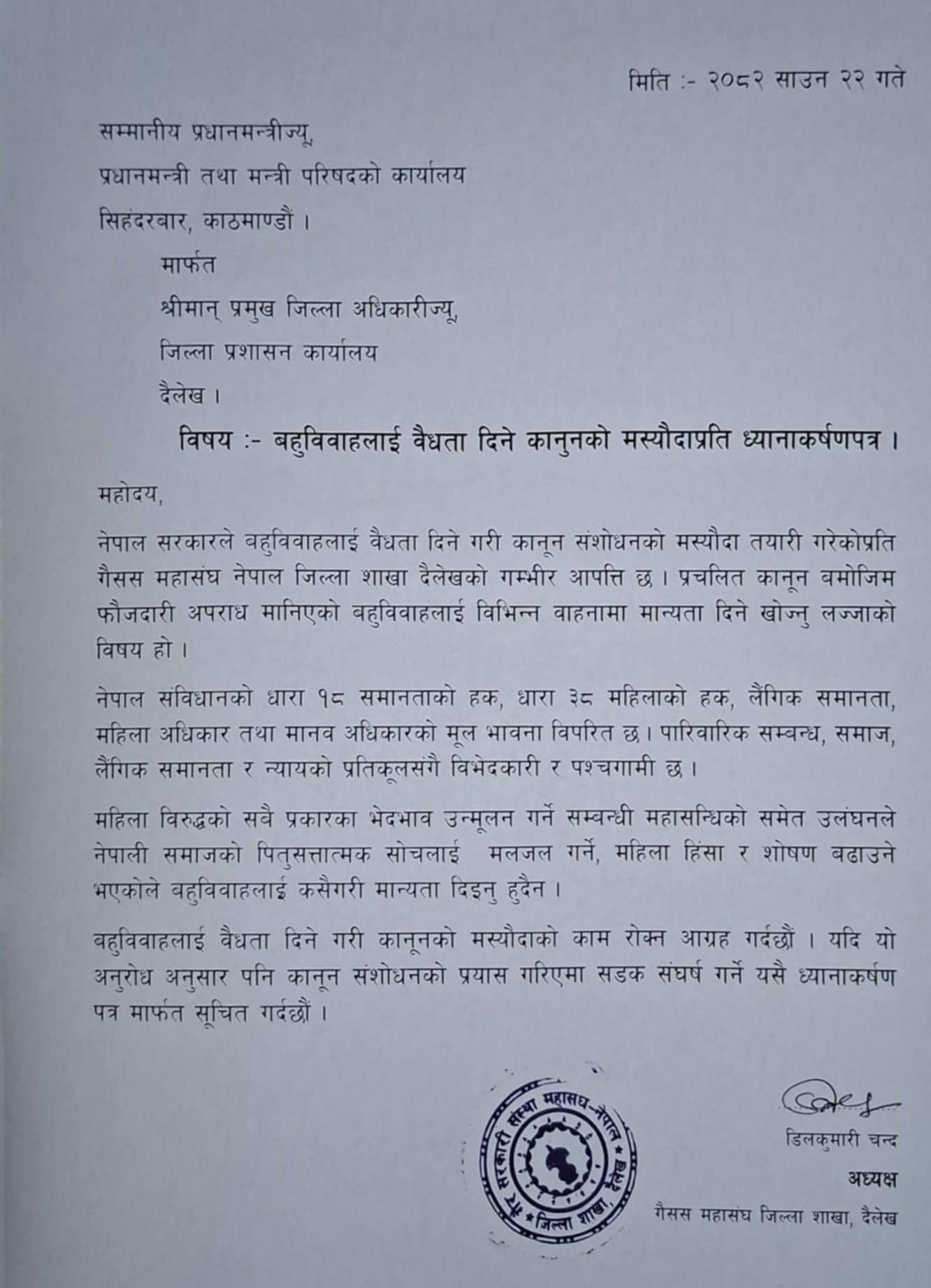 दैलेख – बहुविवाहलाई कानूनी मान्यता दिन मुलुकी अपराध सहिता ऐन संशोधन गर्न लागिएको विषयमा गैसस महासंघ नेपाल दैलेख शाखाले आपत्ति जनाएको छ । ऐन संशोधनको मस्यौदाको काम रोक्न महासंघले बुधबार दैलेखका प्रमुख जिल्ला अधिकारी मार्फत नेपाल सरकारलाई ध्यानाकर्षणपत्र पठाएको छ ।