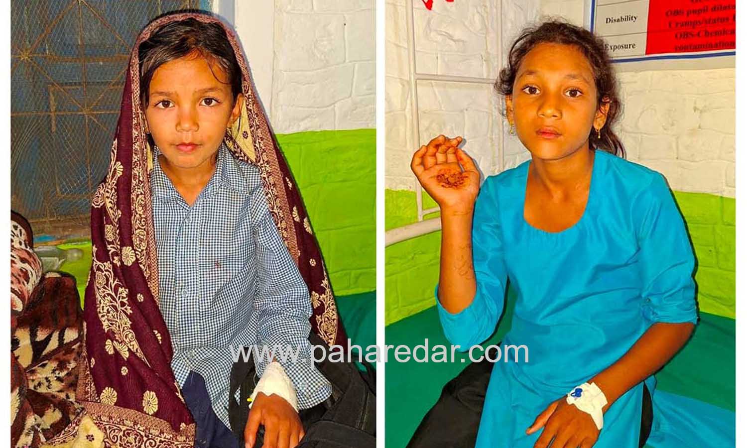 डुंगेश्वर गाउँपालिका-२ स्थित नेपाल राष्ट्रिय प्राथमिक विद्यालय उममा ३ कक्षामा पढ्ने प्रतिमालाई विद्यालय जान हिंडिरहेको बेला टाउरी भन्ने ठाउँमा साथीहरुले जिस्काएको अरिंगालले टोकेको दिदी लीला थापाले बताउनुभयो । त्यस्तै कक्षा ६ मा अध्ययनरत यमुनालाई बिन्ध्यवासिनीकाे रैनादेवी मावि टाटामाखु जाँदै गर्दा बाजकाटियाँ नजिक सर्पले हातमा टोकेको बताइएको छ ।