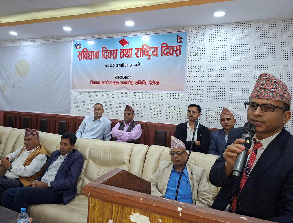 केन्द्र सरकारले संविधान दिवस सामान्य रुपमा मनाउन केन्द्रले परिपत्र गरे पनि दैलेखमा स्थानीय प्रशासनको समन्वयकारी भूमिकाले अरु बेला भन्दा अँझ धेरै उत्साहपूर्ण सहभागितामा सन्देशमूलक प्रभातफेरिसंगै बृहत विचार विमर्श सहित संविधान दिवस मनाइयो ।