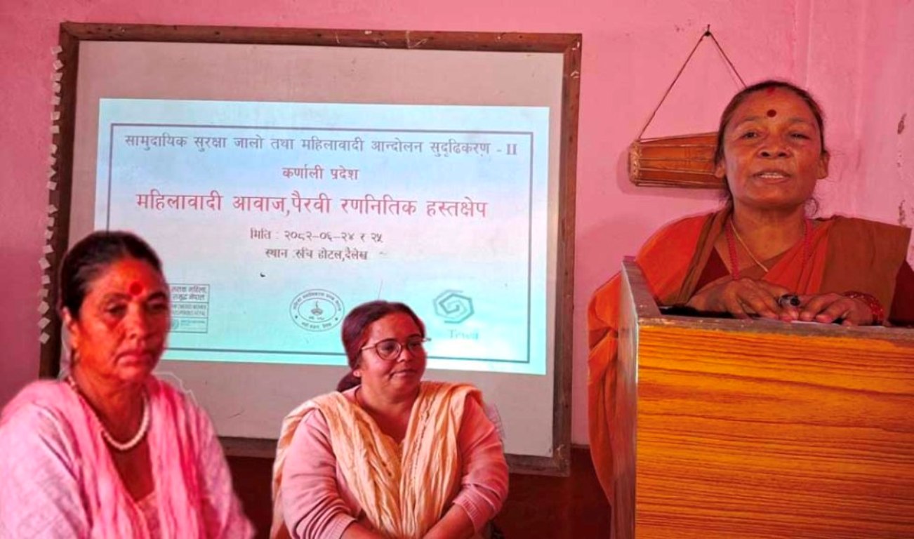 दैलेख – गैरसरकारी संस्था महासंघ दैलेखका अध्यक्ष डिलकुमारी चन्दले महिला मुक्तिका लागि पीडित आफै तयार हुनुपर्ने बताउनुभएको छ । टेवा नेपाल, यूएन वुमन, यूरोपियन यूनियन र फिनल्याण्डको साझेदारीमा महिला सशक्तिकरण मञ्चले आजदेखि सञ्चालन गरेको २ दिने महिलावादी आन्दोलन र पैरबी रणनीति तालिम शुभारम्भ कार्यक्रममा उहाँले यस्तो कुरा बोल्नुभएको हो ।