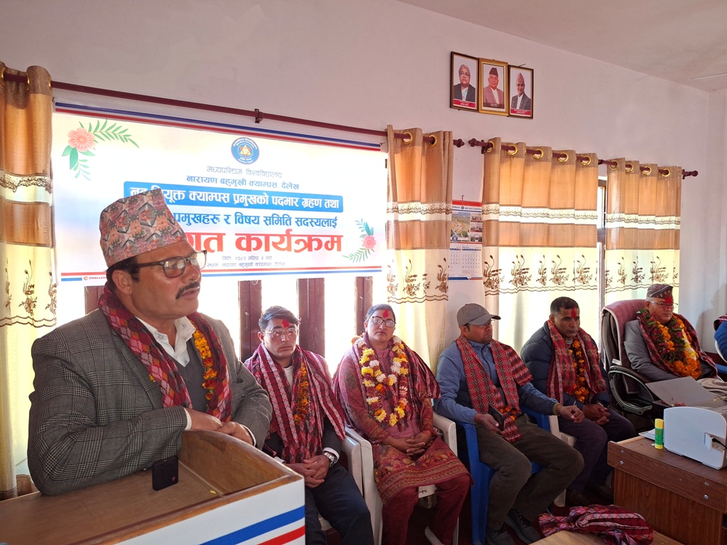 नारायण नगरपालिकाका मेयर लोमन शर्माले नव नियुक्त क्याक्पस प्रमुख शाही र विभागीय संयोजकहरुलाई क्याम्पसको शैक्षिक गुणस्तर सुधारमा जोड दिन आग्रह गर्नुभयो । उहाँले विद्यार्थीहरुमा सकारात्मक भावनाको विकास गर्ने पाठ्यक्रम नै बनाउनपर्ने आवश्यकता रहेको औल्याउनुभयो ।