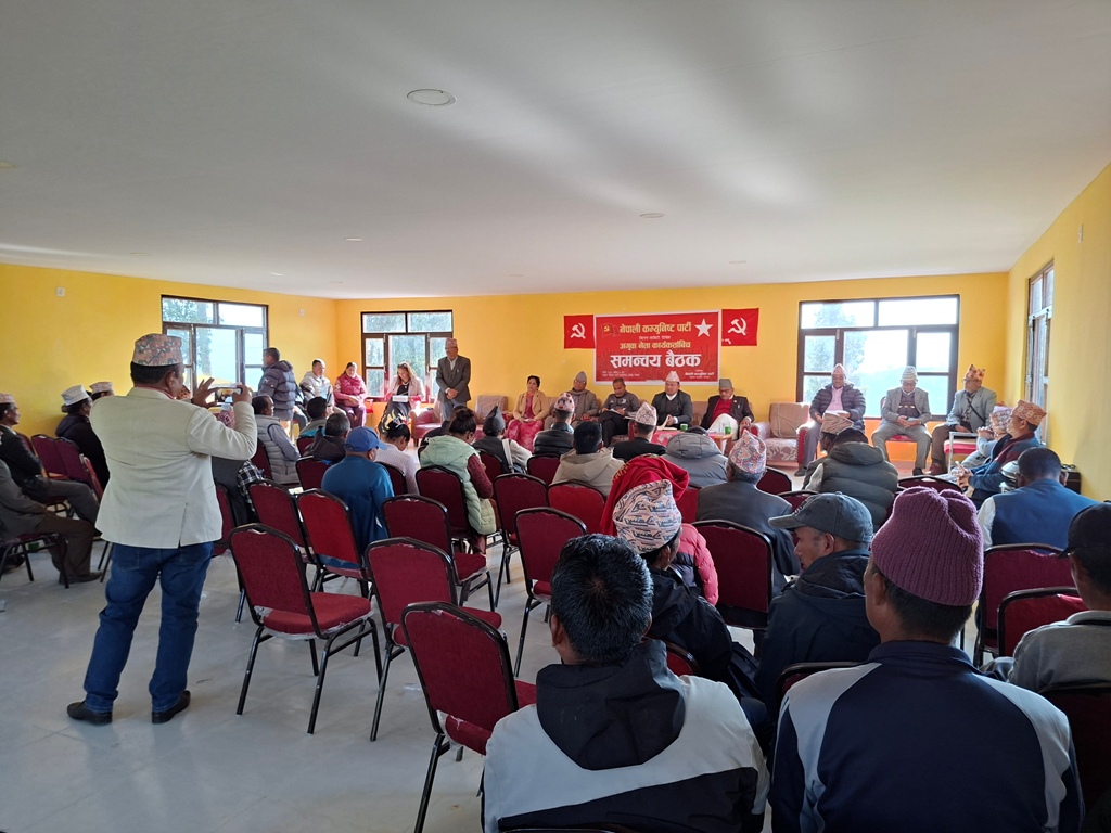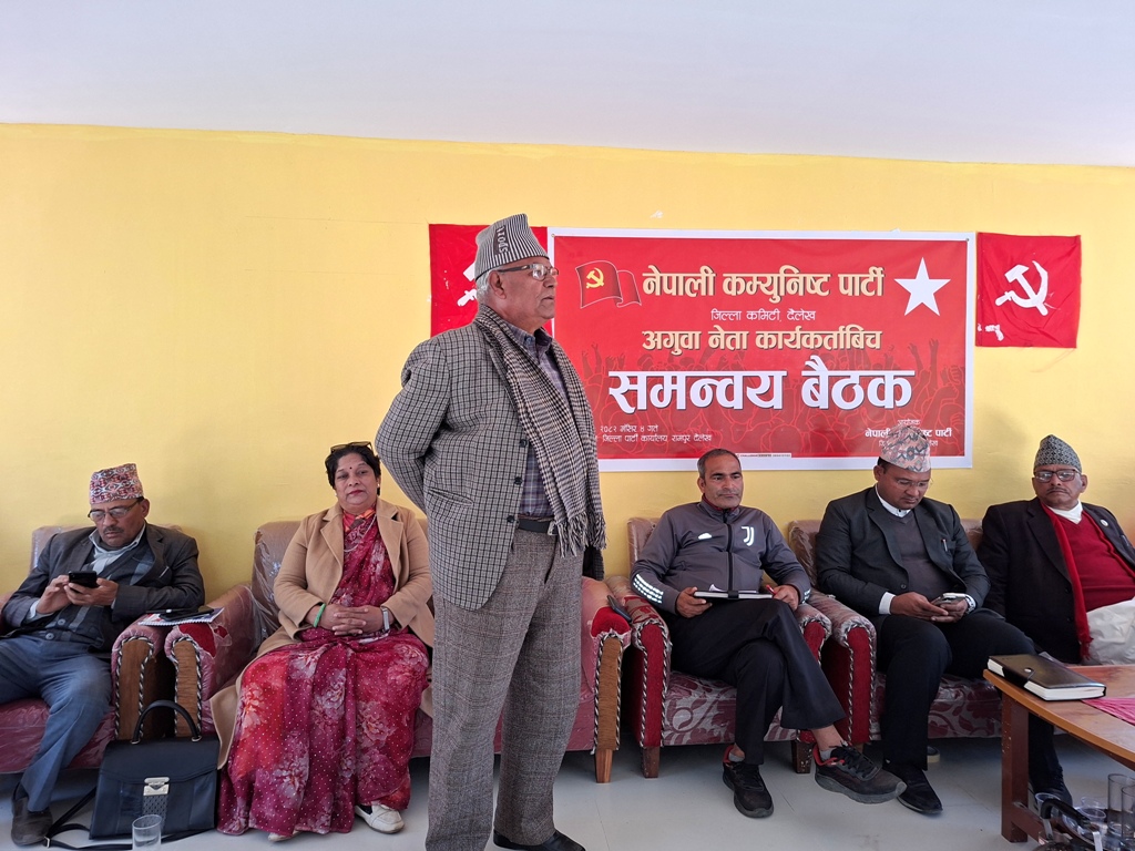 दैलेख – बामपन्थीहरुलाई एकीकृत गराउन केन्द्रस्तरमा पार्टी एकता अभियान अन्तरगत गठित नेपाली कम्यूनिष्ट पार्टी (नेकपा)को दैलेखमा आज जिल्ला स्तरीय समवन्वय बैठक बसेको छ । नेकपामा समाहित भएका नेपाल कम्यूनिष्ट पार्टी माओवादी केन्द्र र नेपाल कम्यूनिष्ट पार्टी एकीकृत समाजवादीका केन्द्र, प्रदेश र जिल्ला स्तरीय नेतृत्वमा रहेका नेताहरुको सहभागिता थियो ।