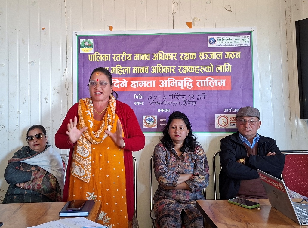 दैलेख – महिला अधिकारको सवाललाई संगठित र एकीकृत रुप पैरबी गर्न दैलेखको भैरबी गाउँपालिकामा महिला मानव अधिकार रक्षक सञ्जाल गठन गरिएको छ । एईआईएन लक्जेम्वर्गको साझेदारीमा सोसेक नेपालद्वारा सञ्चालित आधार परियोजनाले लैंगिक हिंसा विरुद्धको १६ दिने अभियानको सन्दर्भमा शुक्रबार भैरीकालिकाथुममा अगुवा महिलाहरुका लागि १ दिने क्षमता अभिवृद्धि तालिमका सहभागीहरु मध्येबाट महिला मानव अधिकार रक्षक सञ्जाल गठन गरिएको हो ।