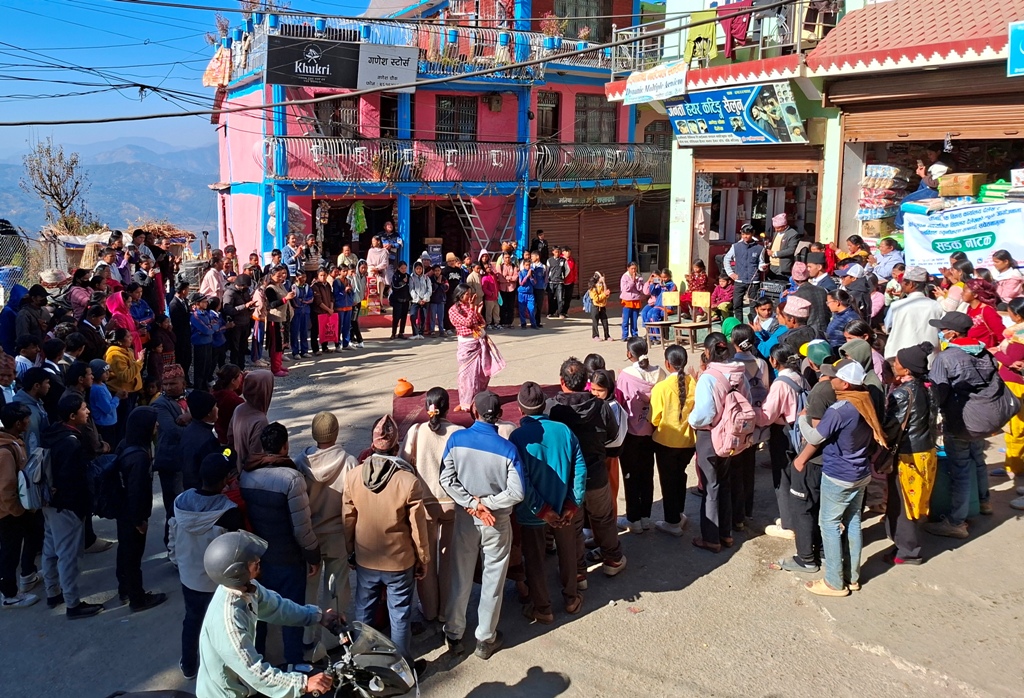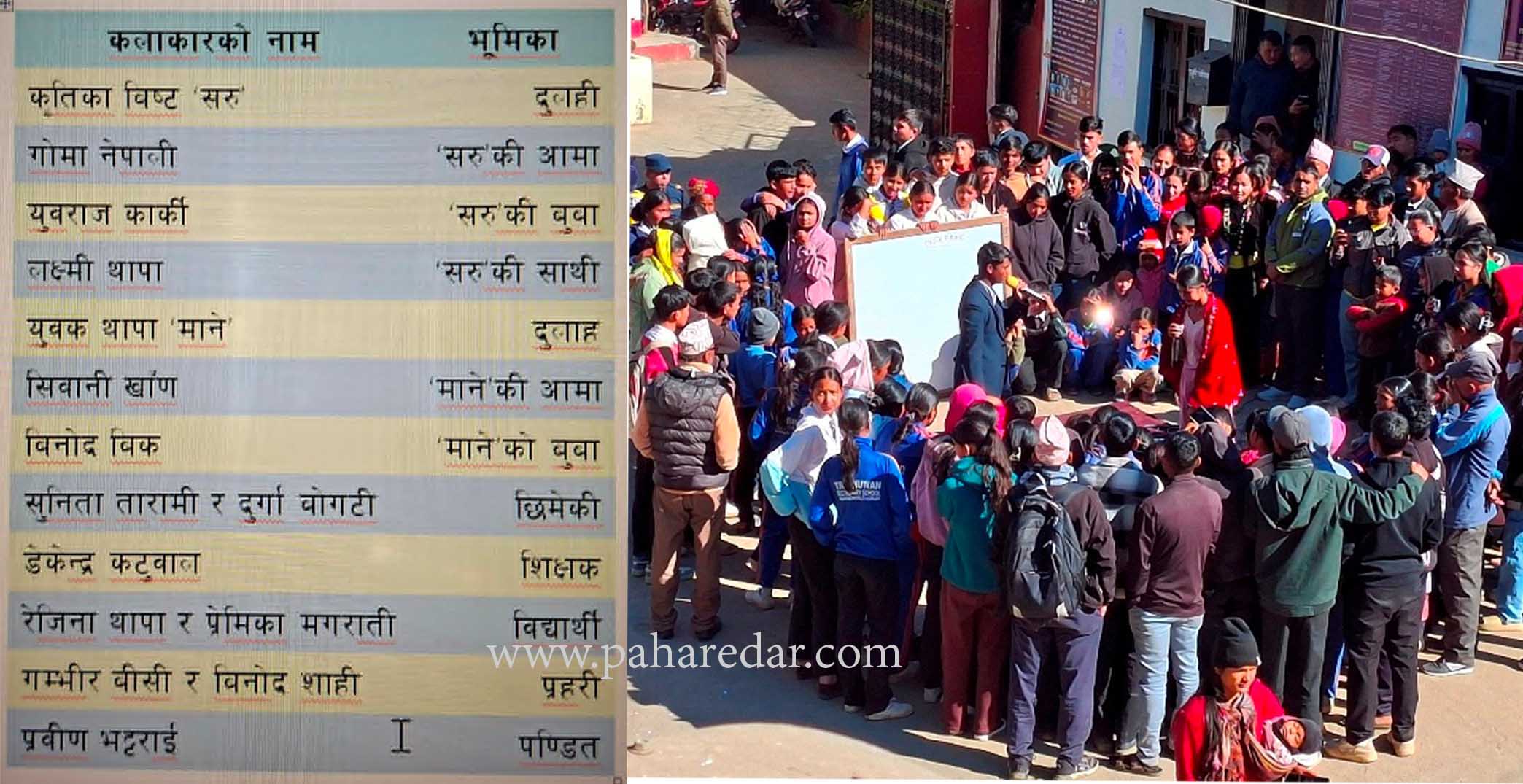 यो कथा सामाजिक विकास कार्यालय दैलेखले बिहीबार जिल्ला सदरमुकामको देवकोटो चोक र गणेशचोकमा सामाजिक कुरीति र हानिकारक कुचलन हटाउन बालविवाह रोकथाम सम्वन्धी सडक नाटकमा देखाइएको दृश्य हाे । त्रिभुवन मावि दैलेखबजारका शिक्षकद्वय भक्तबहादुर थापा र हरिप्रसाद न्यौपानेको लेखन तथा निर्देशनमा त्यही विद्यालयका विद्यार्थीहरुले सडक नाटक देखाएका थिए ।