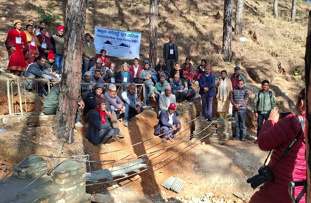 अभ्यास तालिममा साना नमूना सामग्री जोडेर झोलुङ्गे पुलमा तलका लठ्ठामा १ मीटर १० सेण्टीमीटरका क्रसबिन माथि २–२ मीटर लामा स्टीलबेग लम्बवत ३ वटा कस्ने अनि त्यसबाट मानिस हिड्न मिल्ने १ मीटर ६ सेण्टीमीटर चौडा पुलका दुबै साइडमा तलमाथिका लठ्ठालाई सन्तुलन राख्ने १ मीटर १० सेण्टीमीटरका सस्पेण्डर, सुरक्षाका लागि साइडमा जालीको औचित्य समेत तालिममै सहभागीले सिके ।