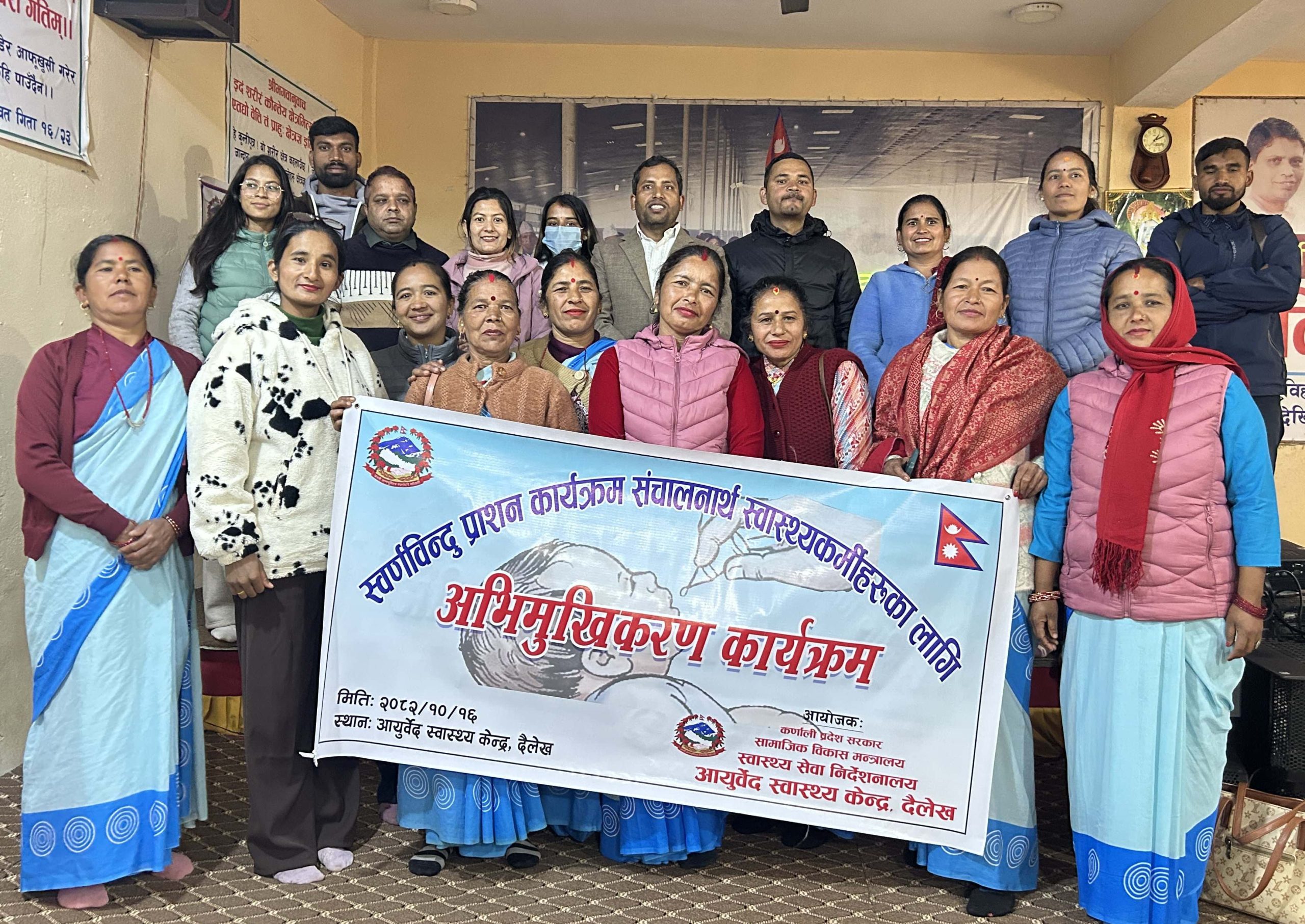 कर्णाली प्रदेश आयुर्वुेद अनुसन्धान केन्द्रका आयुर्वेद विज्ञ डा. खेमराज तिमिल्सेना र आयुर्वेद स्वास्थ्य केन्द्र दैलेखका इञ्चार्ज डा. यादवप्रसाद उपाध्याय वर्णविन्दू थोपाले स्वास्थ्यमा दिने ऊर्जा बारे अभिमुखीकरण गराउनुभएको थियो । नारायण नगरपालिका नं. ६ का वडाध्यक्ष जनक न्यौपानेले दिगाे उपचारमा आयुर्वेद औषधिको प्रभाव बारे बोल्नुभएको थियो ।