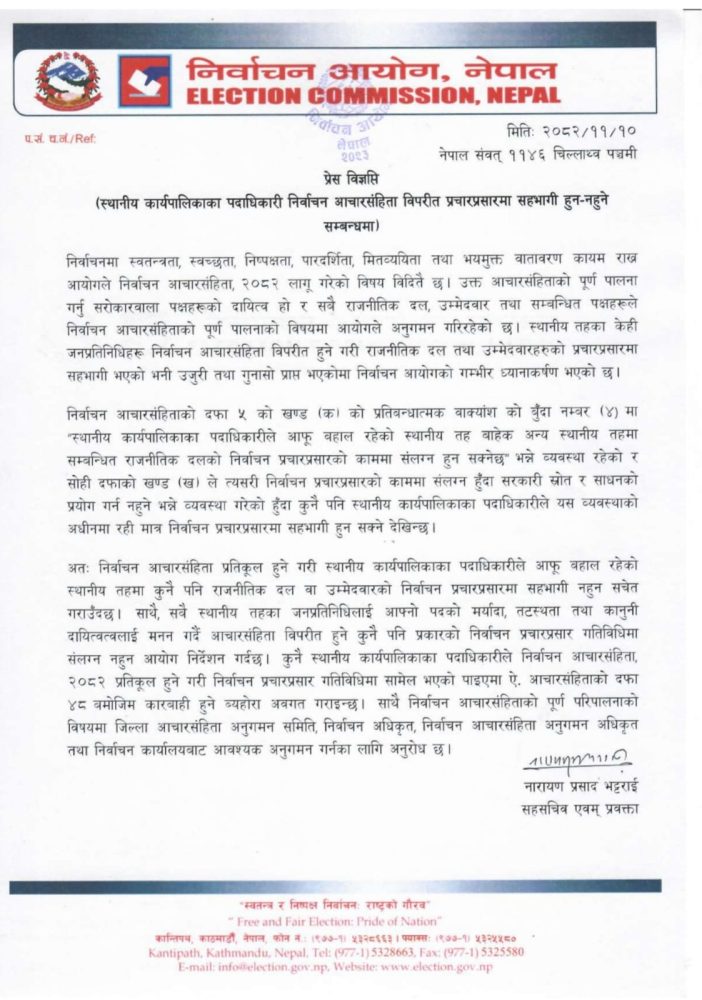 दैलेख – ताेकिएकाे जिम्मेवारीका काम छोडेर दलीय चुनाव प्रचारमा जुटेको सिकायतपछि निर्वाचन आयोगले स्थानीय तहका जनप्रतिनिधिहरुले दल र उम्मेदवारको प्रचारप्रसारमा सहभागी हुन नपाइने परिपत्र गरेको छ । प्रतिनिधिसभा निर्वाचन आचारसहिंता २०८२ को दफा ५ को पालना गर्दै स्थानीय तहका जनप्रतिनिधिहरुलाई प्रचारमा जुट्न र साधनश्रोत दुरुपयोग गर्न नगर्न आग्रह गरिएको छ ।