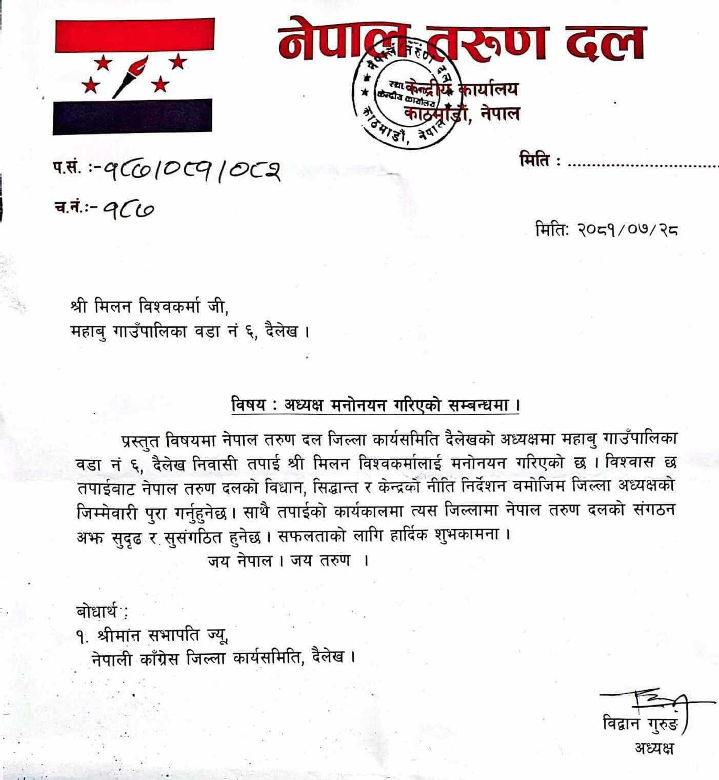दैलेख – नेपाल तरुण दल केन्द्रीय समितिले दैलेख शाखा अध्यक्षमा मिलन बिश्वकर्मालाई मनाेनीत गरेको छ । नेपाल तरुण दलका केन्द्रीय अध्यक्ष विद्वान गुरुङ्गले बुधबार एक पत्र लेख्दै महाबु गाउँपालिका–६ निवासी बिश्वकर्मालाई जिल्ला अध्यक्षको जिम्मेवारी दिइएको उल्लेख गर्नुभएकाे छ ।