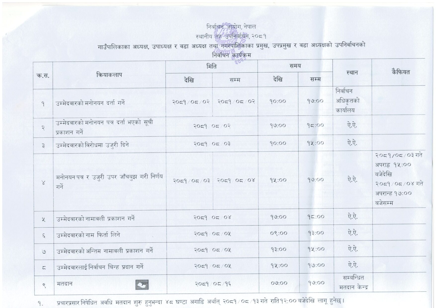 निर्वाचन अधिकारी सलामी अनुसार कात्तिक ३० गते शुक्रबार उपनिर्वाचन हुने स्थानमा कार्यालय स्थापना गर्ने, मंसिर २ गते उम्मेदवारी दर्ता गर्ने, ३ गते उम्मेदवार विरुद्ध दावी बिरोध, ४ गते दावी विरोधको जाँचबुच गरी निर्णय दिने, ५ गते उम्मेदवारी फिर्ता लिन पाउने र ५ गते उम्मेदवारलाई निर्वाचन चिन्ह दिने निर्वाचन कार्यतालि रहेको छ ।