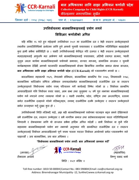मंसिर १६ गते हुन गइरहको उपनिर्वाचन २०८१ मा बालबालिकाहरुलाई प्रयोग नगर्न सिसिआर कर्णालीको अपिलमा निर्वाचनमा बालबालिकाहरुलाई प्रचारप्रसार, अतिथि स्वागत सत्कार, र्याली, जुलुस जस्ता उपनिर्वाचन प्रचारप्रसार गतिविधिका कार्यमा बालबालिकाको राजनीतिक दल र स्वतन्त्र उम्मेदवारले दुरुपयोग नगर्न बाल अधिकारका लागि साझा अभियान (सीसीआर) कर्णाली प्रदेशले आग्रह गरेको छ ।