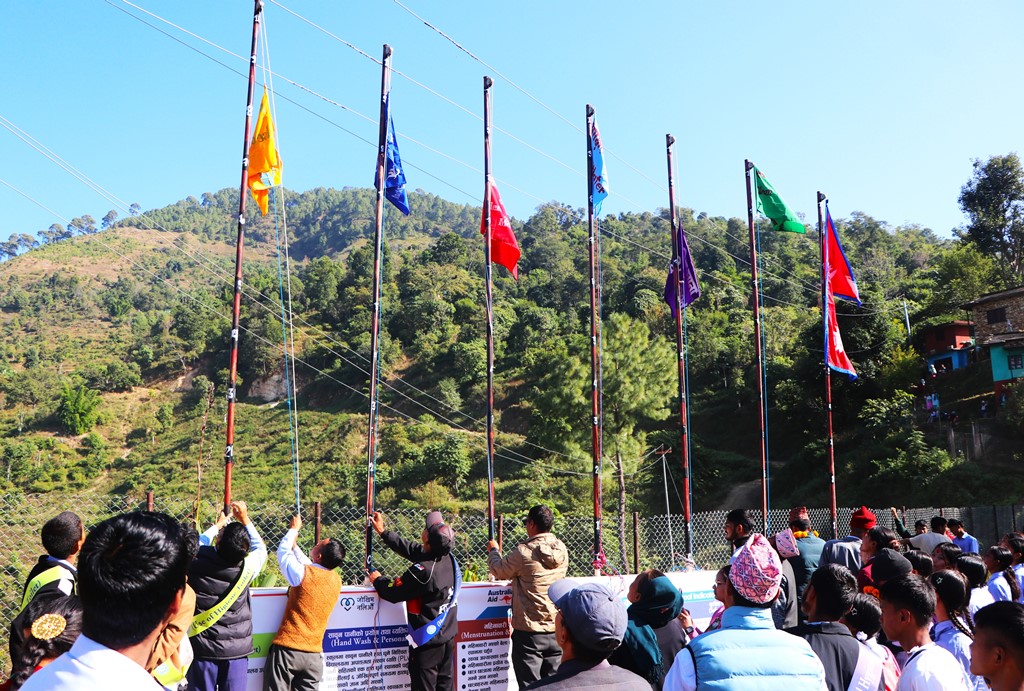 दुई तारे विद्यालय घोषणा सभामा सात वटा झण्डोत्तोलन गरिंदै । (फोटो : बिशाल सुनार)