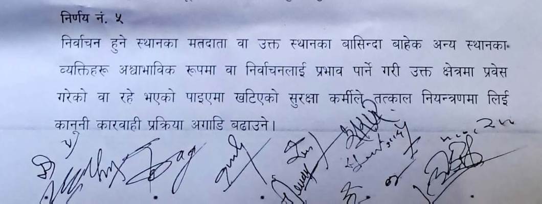 ‘निर्वाचन हुने क्षेत्रमा मौन समय कडाई साथ पालना गर्न लगाउने, राजनीतिक दल र उम्मेदवारले मतदाताहरुलाई प्रभाव, दवावमा नदिने र वाहिरका व्यक्तिहरुलाई सुरक्षाकर्मीहरुले तत्काल नियन्त्रणमा लिई कानूनी कारवाही अगाडि बढाइनेछ’ भनी सर्वपक्षीय वैठकले निर्णय गरेको छ ।